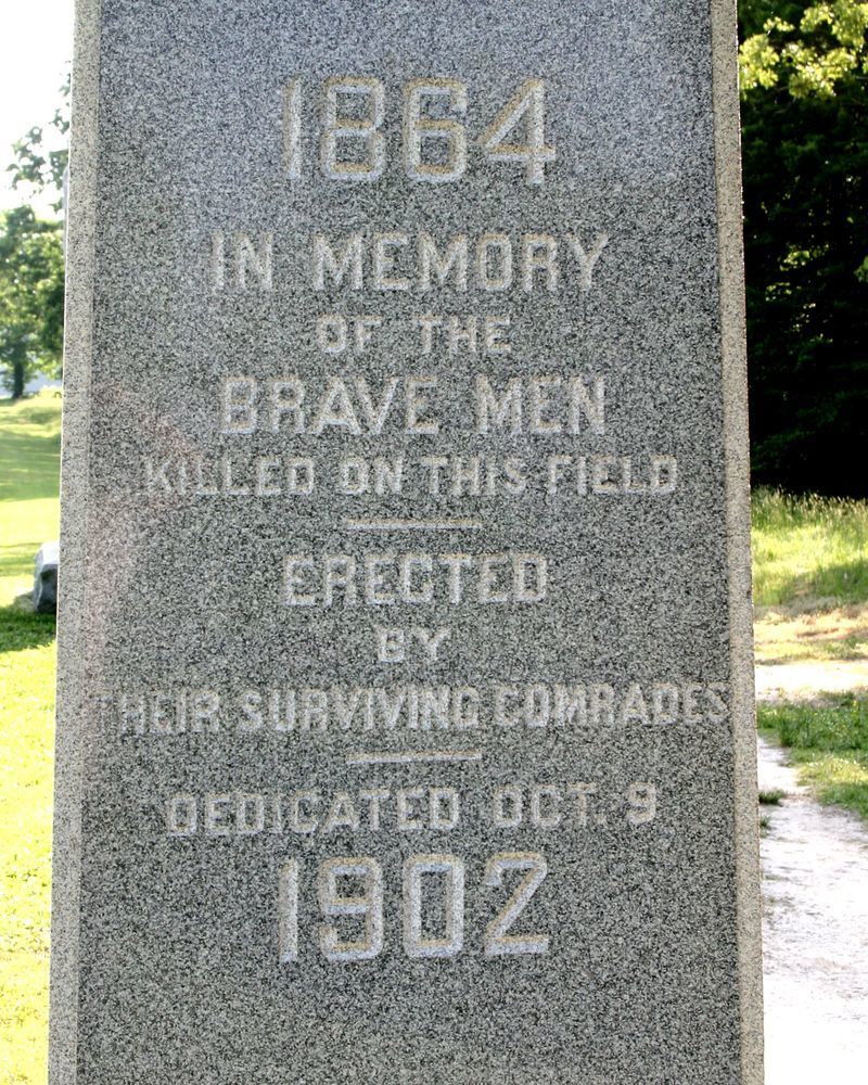 Monument commemorating the holding of this position by 49th New York Regiment at the Battle of the Bloody Angle, May 12, 1864 during the Battle of Spotsylvania. Erected by survivors in 1902. || Rough-hewn, tooled edge, stepped base 2'Hx 3'4"Wx 3'4"D supports square shaft 6'H w/ 4 polished faces bearing incised inscription. Rough-hewn, rounded capital is inscribed on 4 sides w/ Corps insignia & topped by stacked cannon balls.