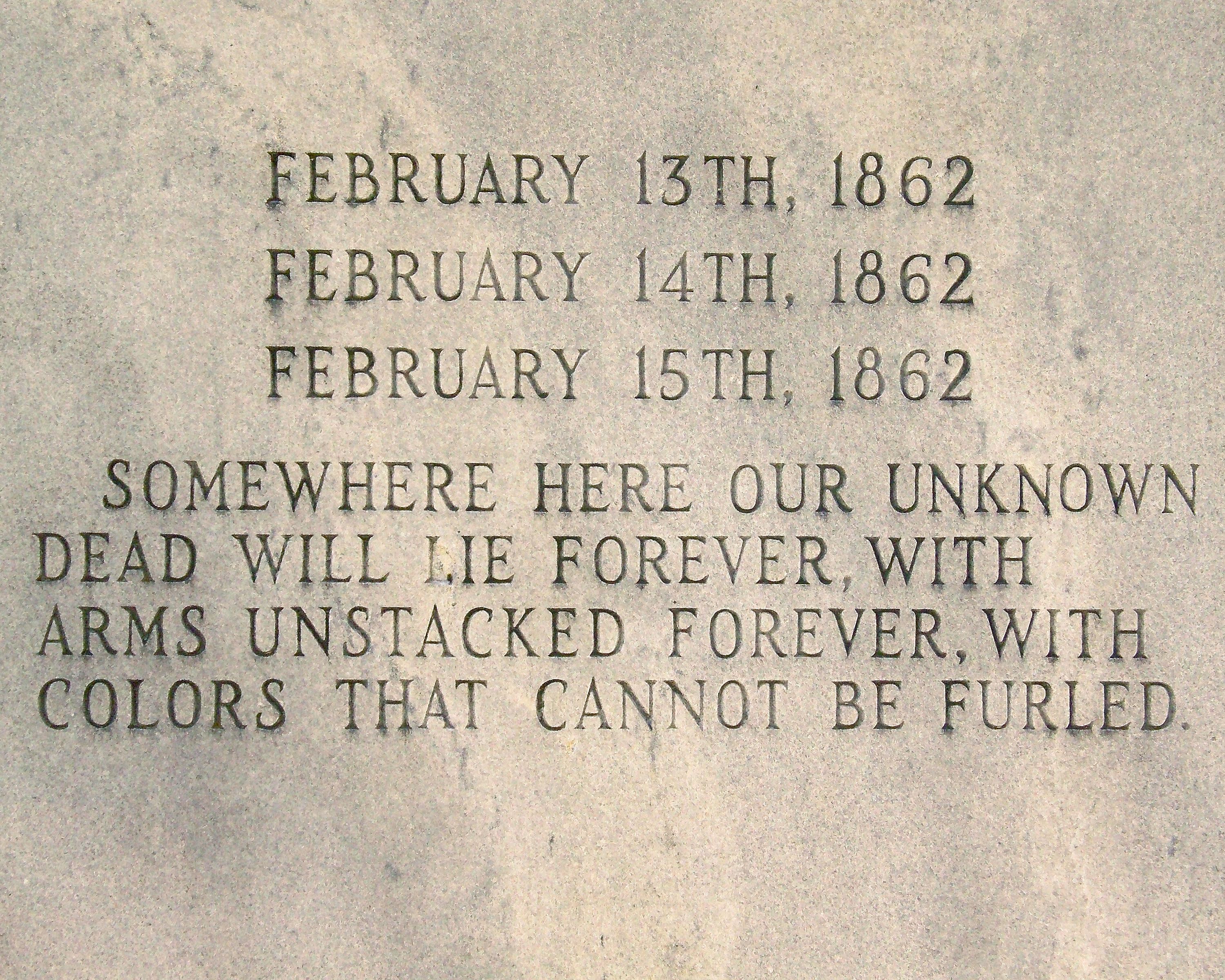 Erected by the Tennessee Division of the United Daughters of the Confederacy in 1933, the Confederate Monument commemorates the Southern soldiers who fought and died at Fort Donelson. The exact location of Confederate graves is unknown. || The Confederate Monument is an approx. 35' tall marble shaft with inscriptions on three sides and a bronze figure of a Confederate soldier on the fourth (east) side. Shaft features a low relief battle flag and CSA monogram. The surrender of Fort Donelson was the North's first major victory of the Civil War. The Confederate Monument is associated with commemorative efforts at Fort Donelson and is a representative example of post-Civil War memorial architecture. || Text of NPS sign at the Confederate Monument: "Because they had fought against the United States, Confederate dead were not buried in the National Cemetary. This monument, erected by the United Daughters of the Confederacy, is a memorial to those men. It was erected in 1933."