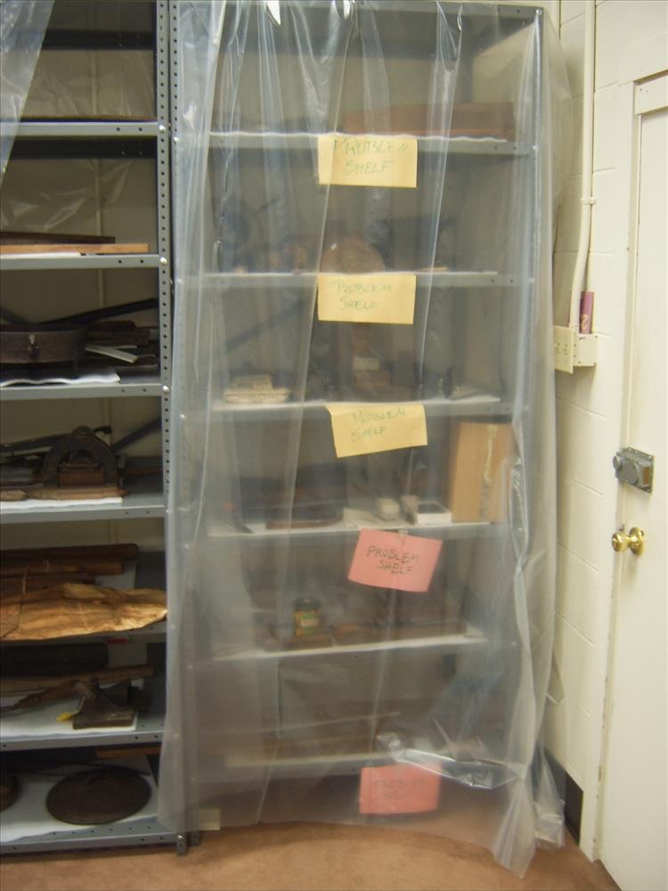 Photos of Park's museum collection taken by Deb Chory, Park Museum Technician. Museum collection shown as temporarily stored at Office of Science and Technological Information at Oak Ridge National Laboratories operated by Department of Energy. Photos show how museum collection/artifacts are not being stored according to standards. Space is limited in this storage facility as is evident in photos.