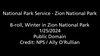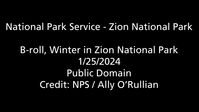 Hikers walking on snowy trials, bridges, and roads, snow falling on trees and red sandstone cliffs, rangers talking to visitors in the snow