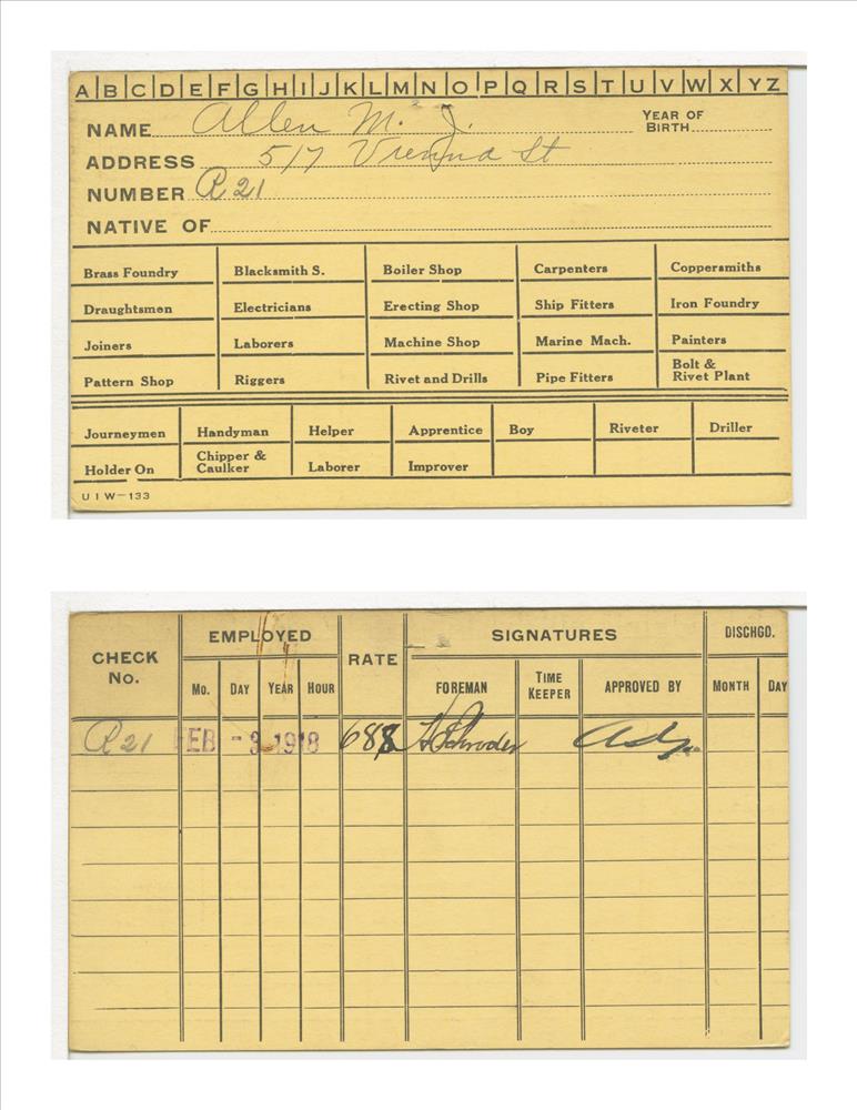 Early twentieth century employee card containing identifying information on the employee, and salary history, from Union Iron Works Co., which had been acquired by Bethlehem Steel Corporation.