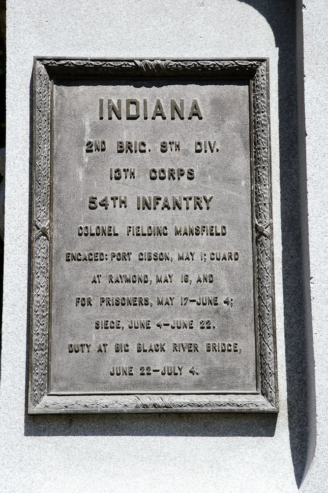 12' x 7'9" x 11'6", smooth-finish gray granite monument with 2-step base, 3-part shaft with 3 bronze inscription tablets, and bronze state seal in capstone. INDIANA appears on top step, and crossed rifles in relief appear on the sides.