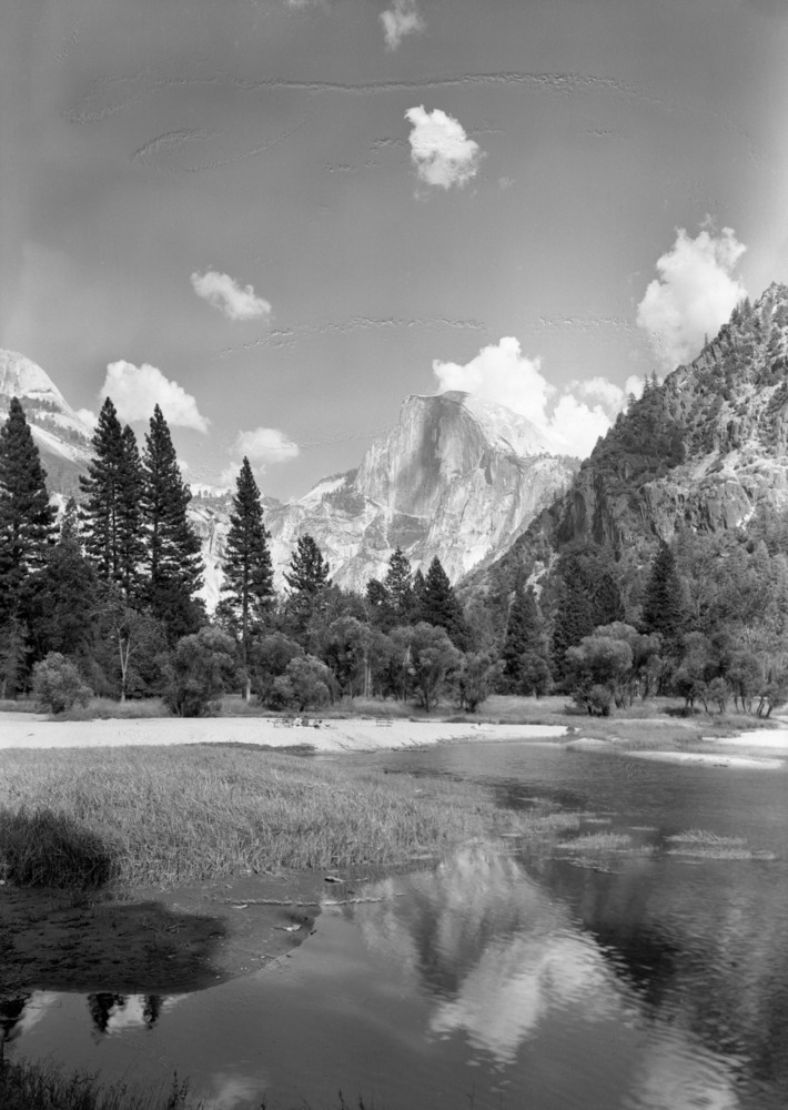Flooded Merced River in foreground with Half Dome in background. Notation on bottom edge of print: "North Dome, Yosemite, CAL; C. R. Savage, Salt Lake". Original print in Yosemite Collections, cat. no. 21,950. This is a copy neg. made by Michael Dixon from
