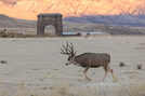 Large mule deer walks across open field with Roosevelt Arch in the background.