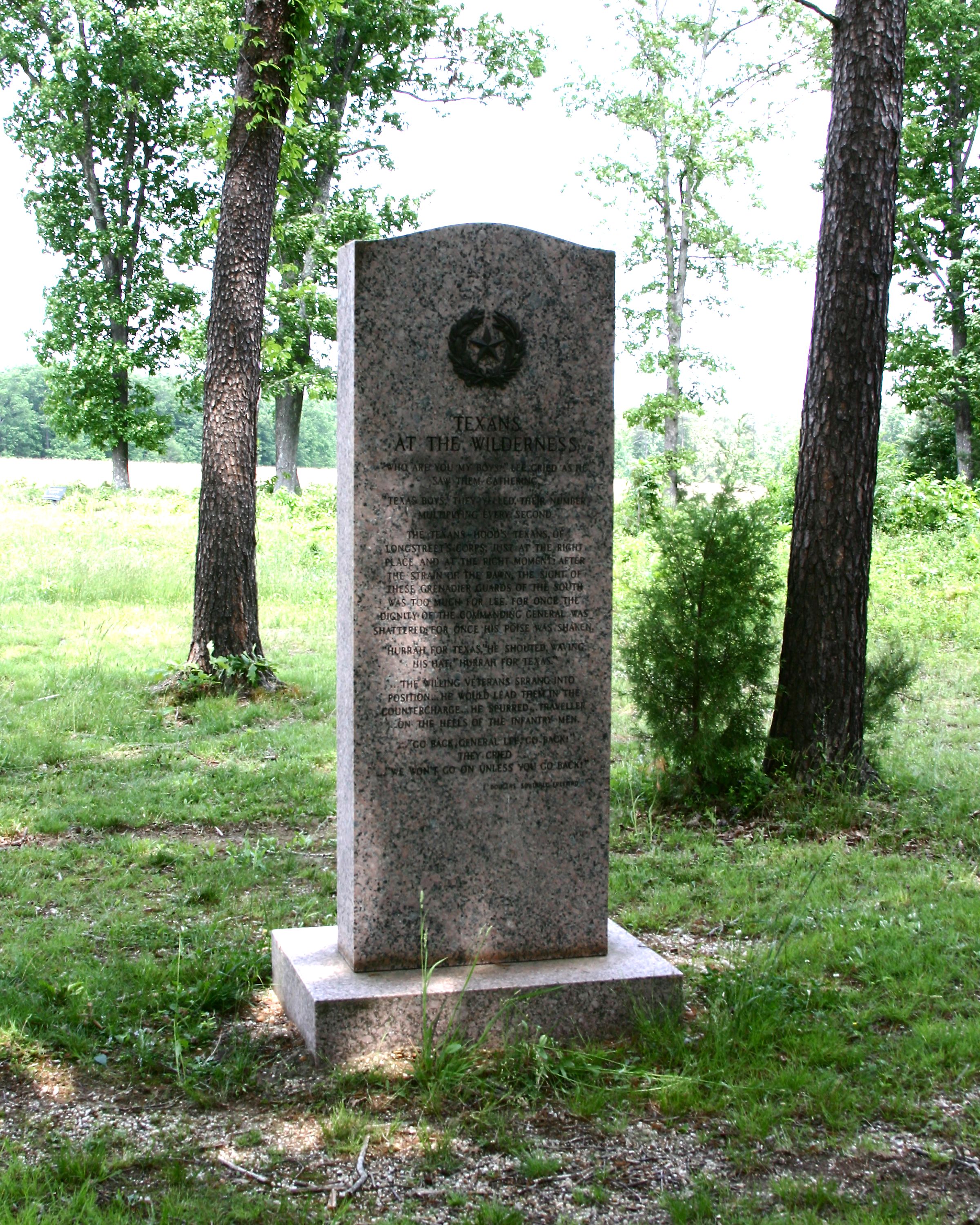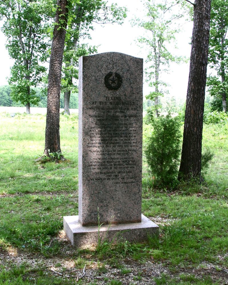 Monument erected by State of Texas at Civil War Centennial to commemorate Texans serving at the Battle of the Wilderness during May 5-6, 1864. || 2 part Monument. Base of polished gray granite, 42"x30"x8"H. Monolithic shaft of polished pink granite, 12"Dx30"Wx7'H, with incised inscription & Texas Star & wreath, front & rear.