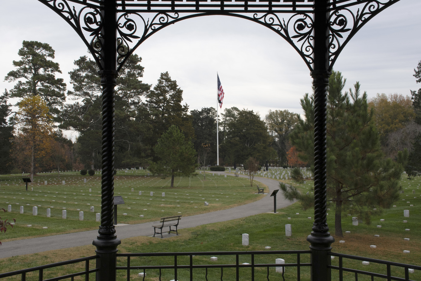 Two wrought iron columns frame a view of thousands of headstones and grave markers along with a handful of trees on an overcast morning.