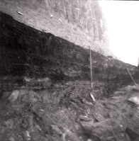 Shovel leaning against rock retaining wall alongside road at the tunnel during rebuilding. ; ZION Museum and Archives Image 002.02.01-8of16 ; ZION 15933