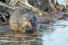 A muskrat sits in shallow water munching on a stalk held between its white claws. Muskrats eat the roots, stems, leaves, and fruits of wetland plants. They create important openings in dense marsh vegetation. Note the blackish brown fur on top and the reddish tinge to the lighter brown sides.