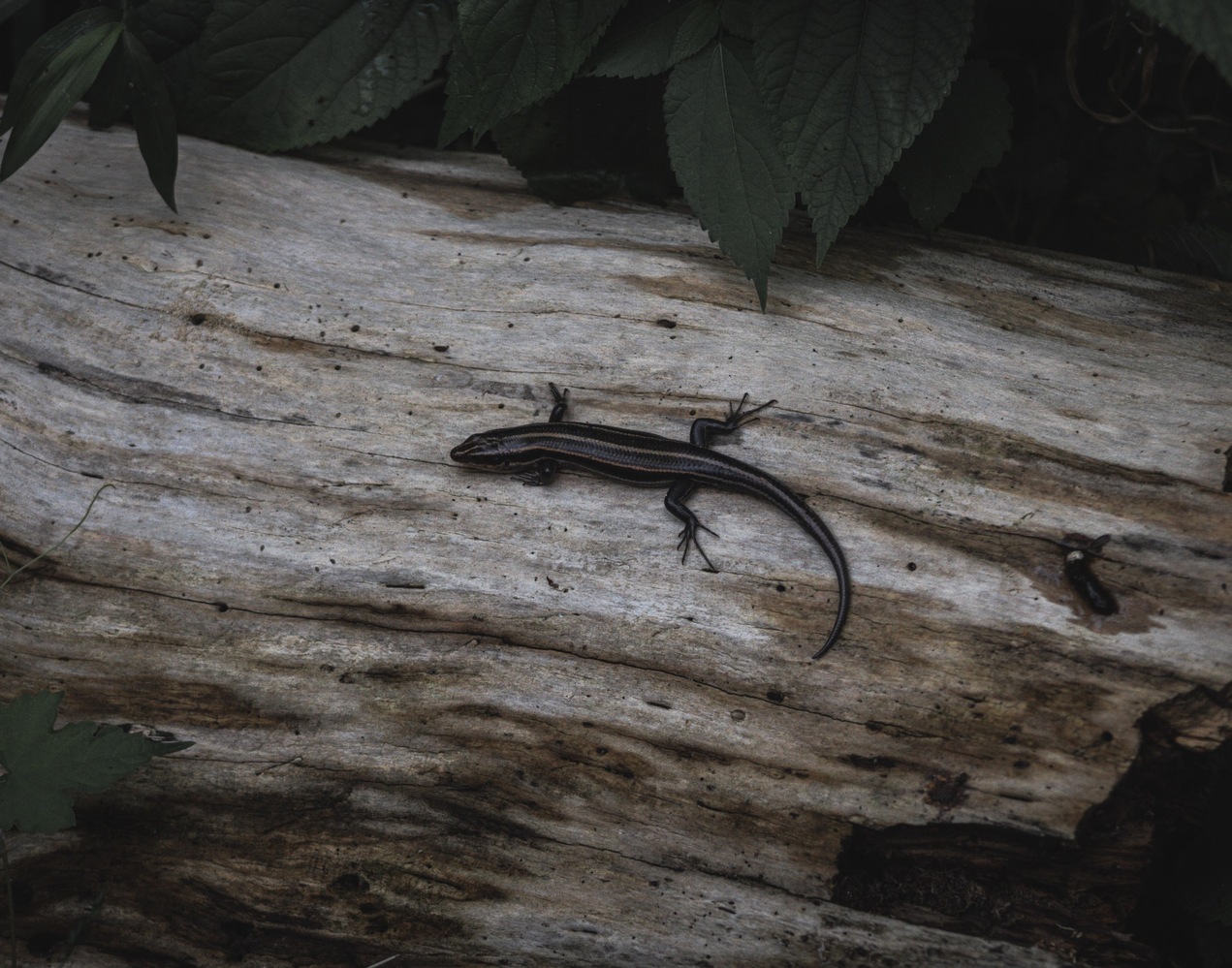 Skink resting on a log next to the boardwalk trail.