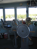 Photo of a ferry wheel house with the steering wheel and nautical instruments in view.
