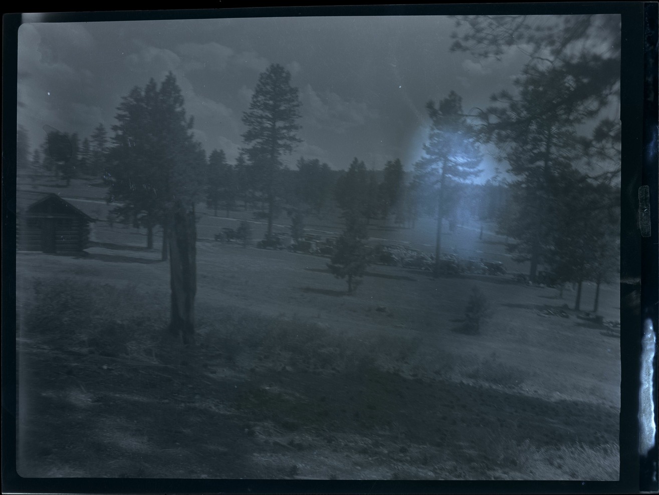 Nitrate negative of cabin and multiple passenger cars in parking lot in meadow area in BRCA. ; BRCA Museum and Archives Image BRCA8875_001_289 ; BRCA 8875