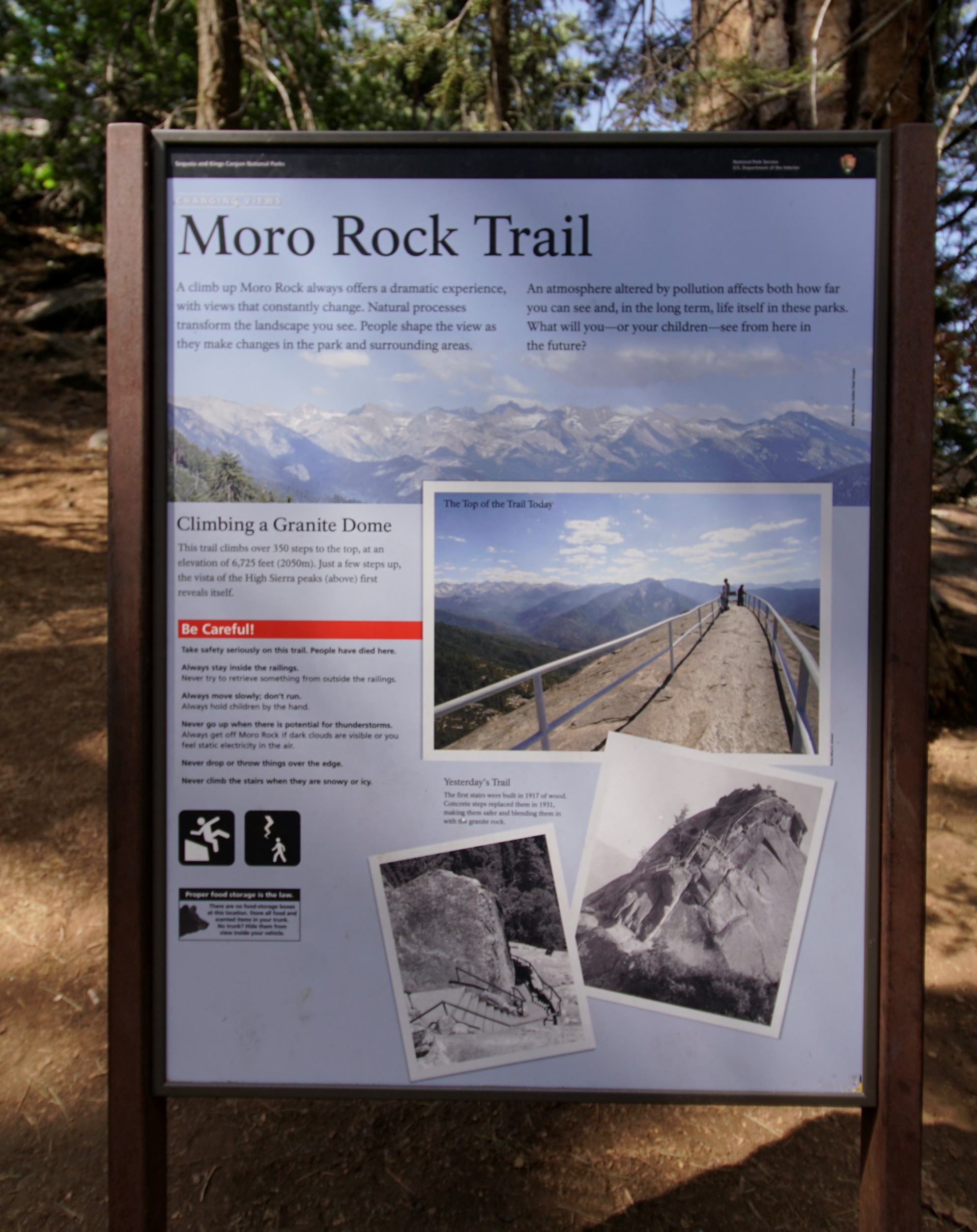 A blue metal panel sits in a metal frame. On the panel is text and images informing park guests about Moro Rock Trail.