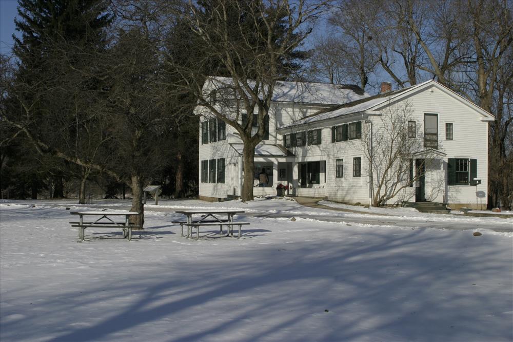 A visitor is at Stanford Hostel in the winter. || Located near Peninsula, Ohio, Hostelling International- Stanford Hostel is a historic nineteenth- century farm home built by George Stanford, one of the first settlers in the Western Reserve. The farm house was built in about 1830. Purchased by the National Park Service in 1978, the hostel has been carefully restored by the National Park Service and Northeast Ohio Council (NOC) of American Youth Hostels (AYH). The Stanford Hostel opened its doors in 1986 to visitors from around the world. AYH is a non-profit organization working exclusively to provide educational travel experiences for people of all ages.