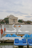 Swan paddle boats and blue paddle boats docked across a pond from the Thomas Jefferson Memorial
