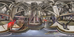 Panoramic photograph of the double helix staircase and metal framework inside the Statue of Liberty