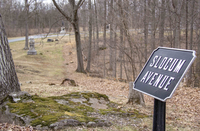 On a small, mossy hill, a plaque reads Slocum Avenue, which overlooks three monuments in the distance. 2 monuments are made of marble and stone and the other monument is a plaque on a large rock. Surrounding the monuments are bare trees, dead leaves and barren grass underneath a cloudly sky.