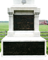 1 of 3 Mn to Minnesota. Indicates position of regiment July 3, 1863 when moved to left to repulse Longstreet's Assault then to right to assist Webb's Brigade at Angle. Located West side Hancock near US Regulars Mn. || 3 part stepped base 6'5"sq, 3rd tier w/bronze tablet inscription on front. 2 part shaft, 1st part columned w/bronze tablet centered between columns on front. 2nd part obelisk w/Corps seal & bronze medallion.