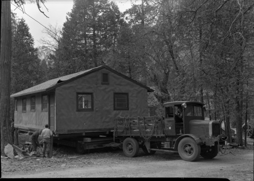 Interior of building used at the Ahwahnee during the Navy occupation. Being transported to Crane Flat by way of Big Oak Flat Road. See RL-19,834-19,838.