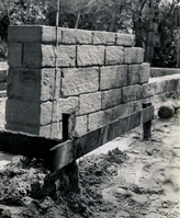 Black and White photo. a portion of the stone wall. Measuring stick, wood supports