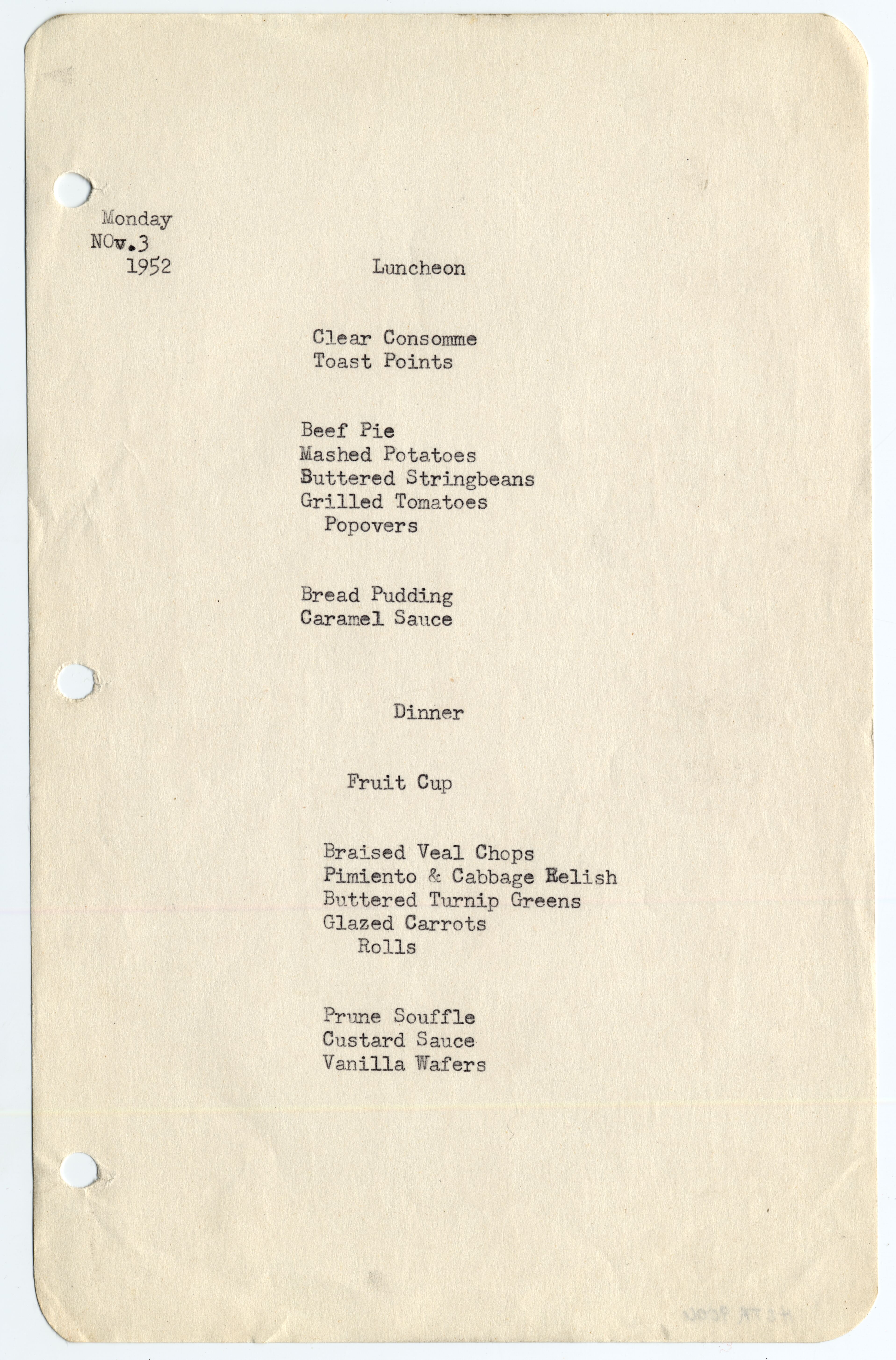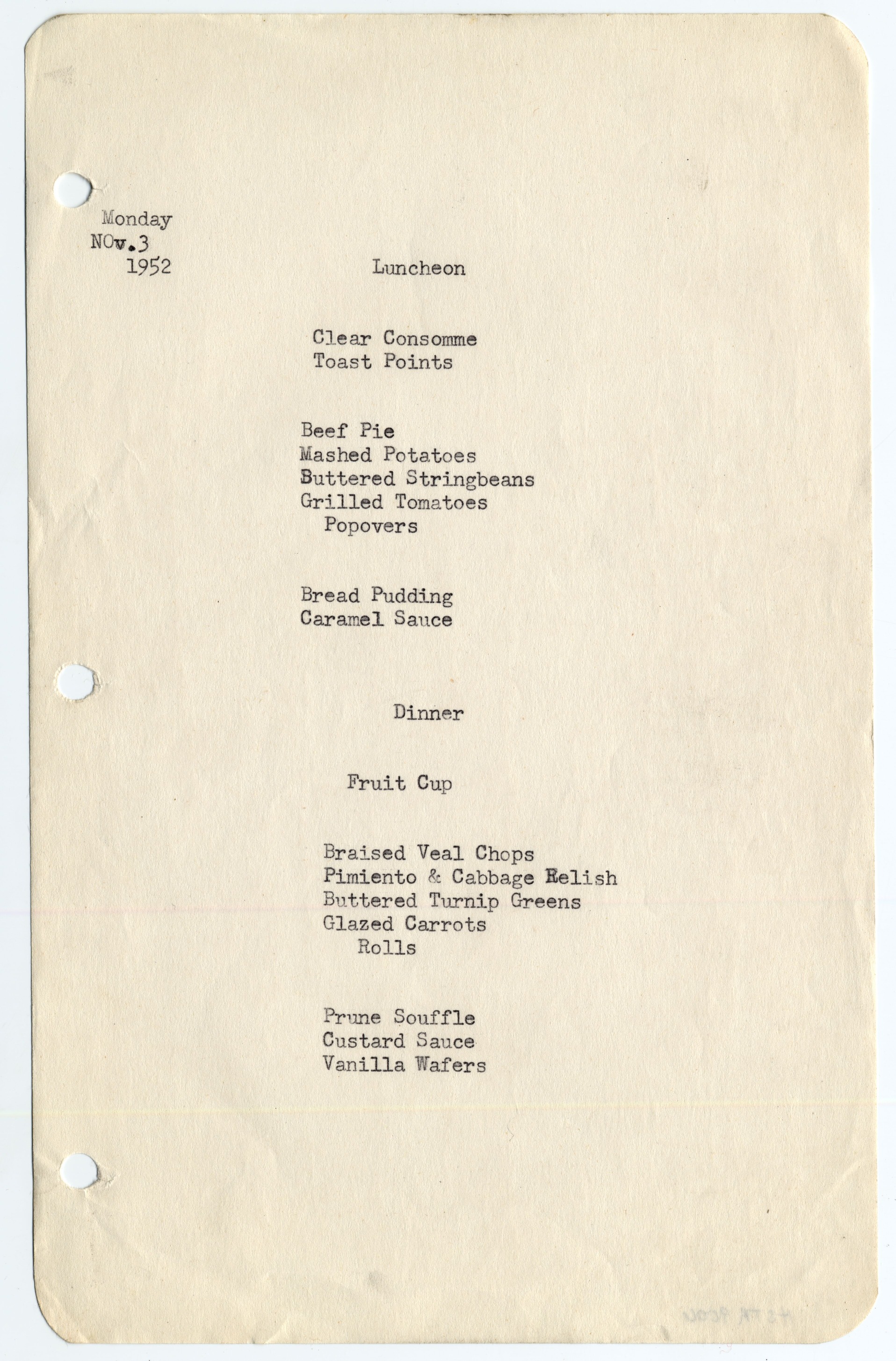 Menus for the Truman's time in the White House from November 1952 to January 1953. There are 81 menus in total. Menus consist of lunch and dinner everyday, including special meals like Cabinet dinners, Thanksgiving, and Christmas meals. Some of the meals have edits made in pencil or notes about how many people and who is going to be gone for the meal.