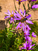 A yellow and black, winged pollinator sits on a purple wildflower.