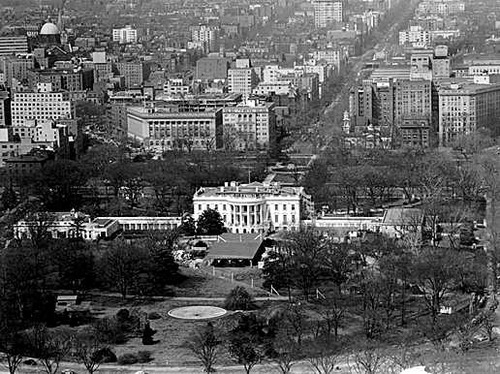 General view of the South Grounds taken from the top of the Washington Monument showing area of construction work and temporary buildings. White House restoration project.