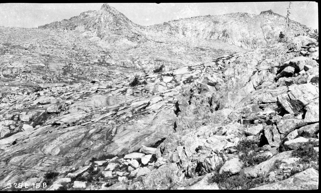 Guy Edwards, Moose Lake Area, SNP, High Sierra Trail Investigation, looking west toward pass east of Moose Lake. Right panel of a two panel panorama. 280000.