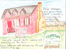 Drawing of a red house with large exterior chimney with a man walking up the front stairs. A horse is in the field in the background. A sign in the foreground says "Ferry Farm - Childhood Home of George Washington. Text has historic anecdotes.