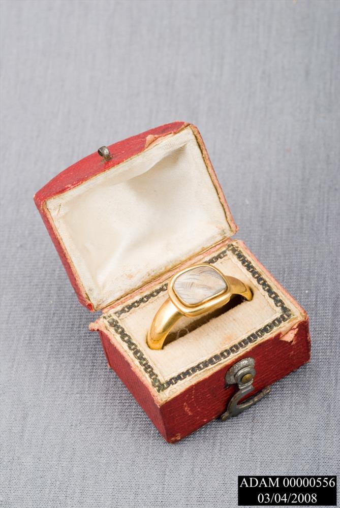 GOLD MOURNING RING MOUNTED WITH CRYSTAL AND THE PLAITED HAIR OF ABIGAIL ADAMS AND JOHN ADAMS. INSCRIBED, "A.A. 28 OCT. 1818; J.A. 4 JULY 1826".