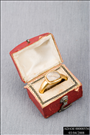IN A SMALL BOX WITH LABEL. BOX IS RED WITH ROUNDED TOP, WHITE SATIN INTERIOR, WHITE FELT IN BOTTOM SECTION WITH INSERT FOR RING.