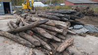 A couple of dozen muddy pointed cedar logs are stacked in a construction site.