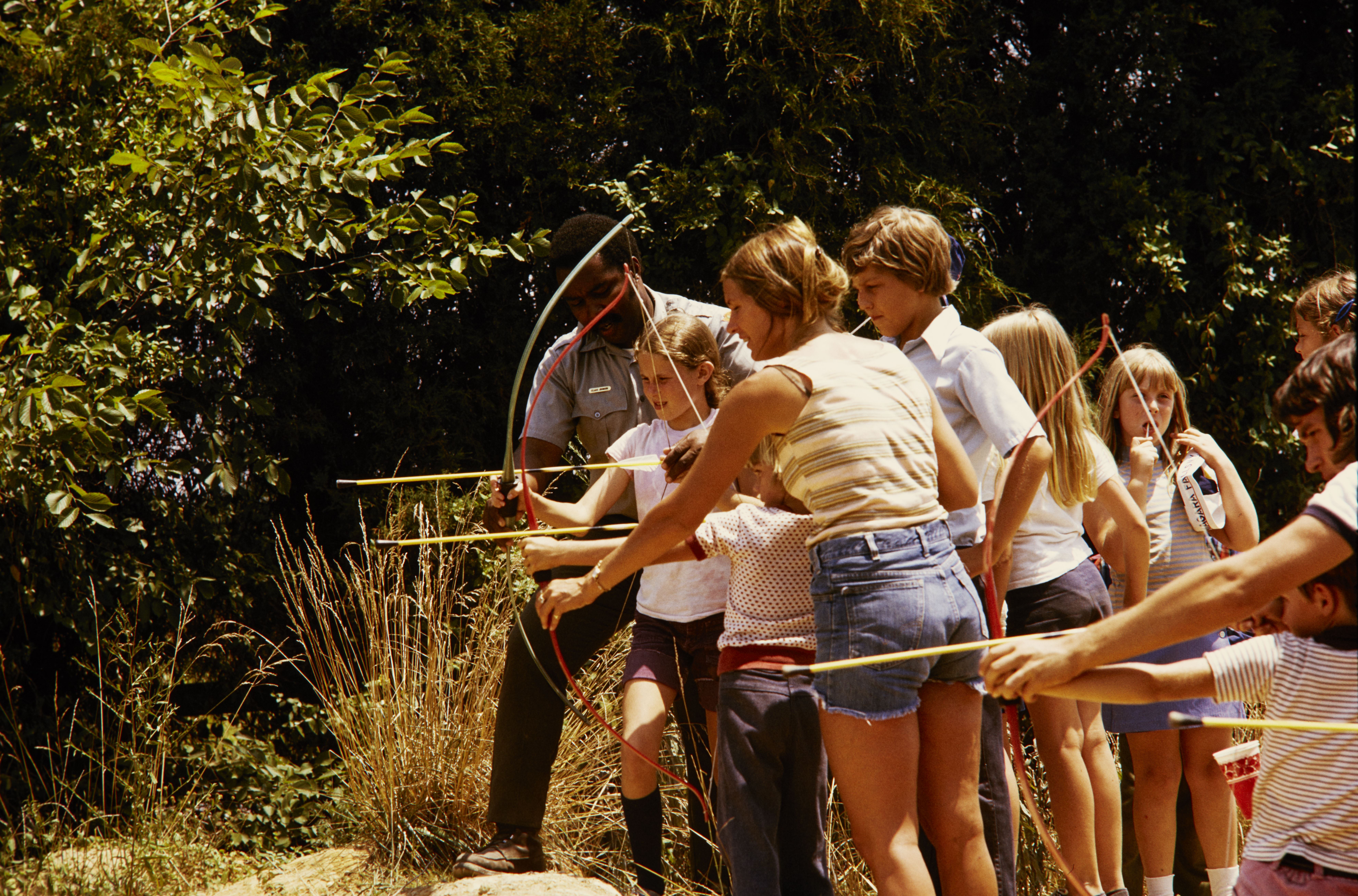 NPS employee showing children how to use a bow and arrow at Richmond National Battlefield Park. Image Number 74-2030-8.