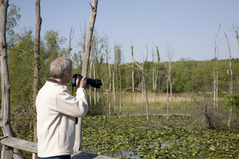 A visitor takes nature photographs at the Beaver Marsh, a site along the Towpath Trail. || Nature photography is a popular activity in Cuyahoga Valley National Park. Cuyahoga Valley Photographic Society promotes CVNP through the photographic arts by providing educational opportunities such as workshops, presentations, photo walks, and an annual photo contest. For more information contact info@cvps.org.