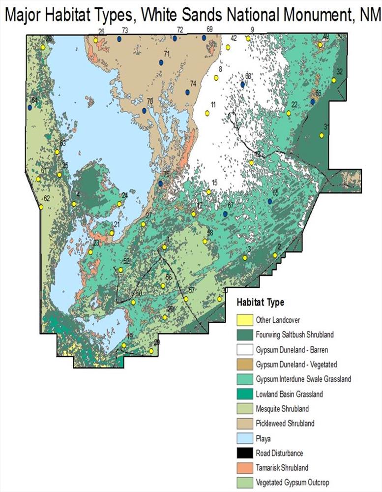 Photo of kit fax habitat at White Sands National Park in 2007, pedestals within the gypsum dunes.