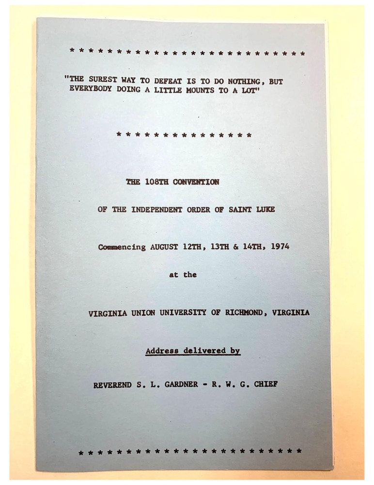 The 108th Convention of the Independent Order of Saint Luke Commencing August 12th, 13th, and 14th, 1974 at the Virginia Union University of Richmond, Virginia, Address delivered by Reverend S. L. Gardner - R. W. G. Chief / This document is primarily a sermon to convention attendees without specific updates on the Independent Order of St. Luke.