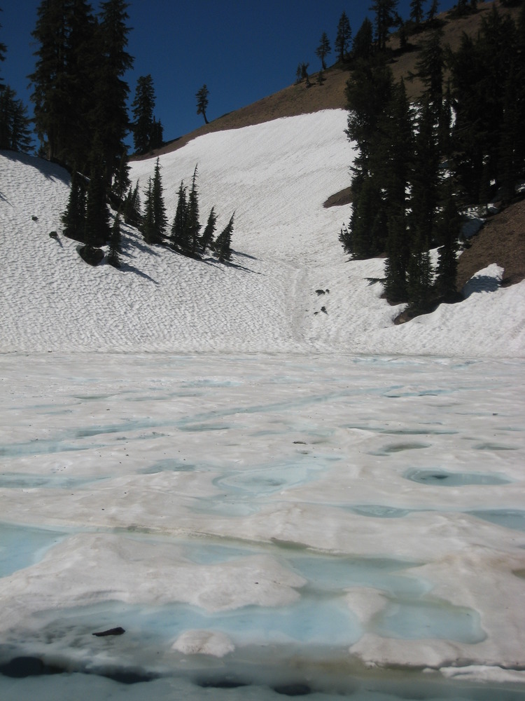 Ice formations and blue ice on the frozen Ridge Lakes with snow on the nearby hillsides.