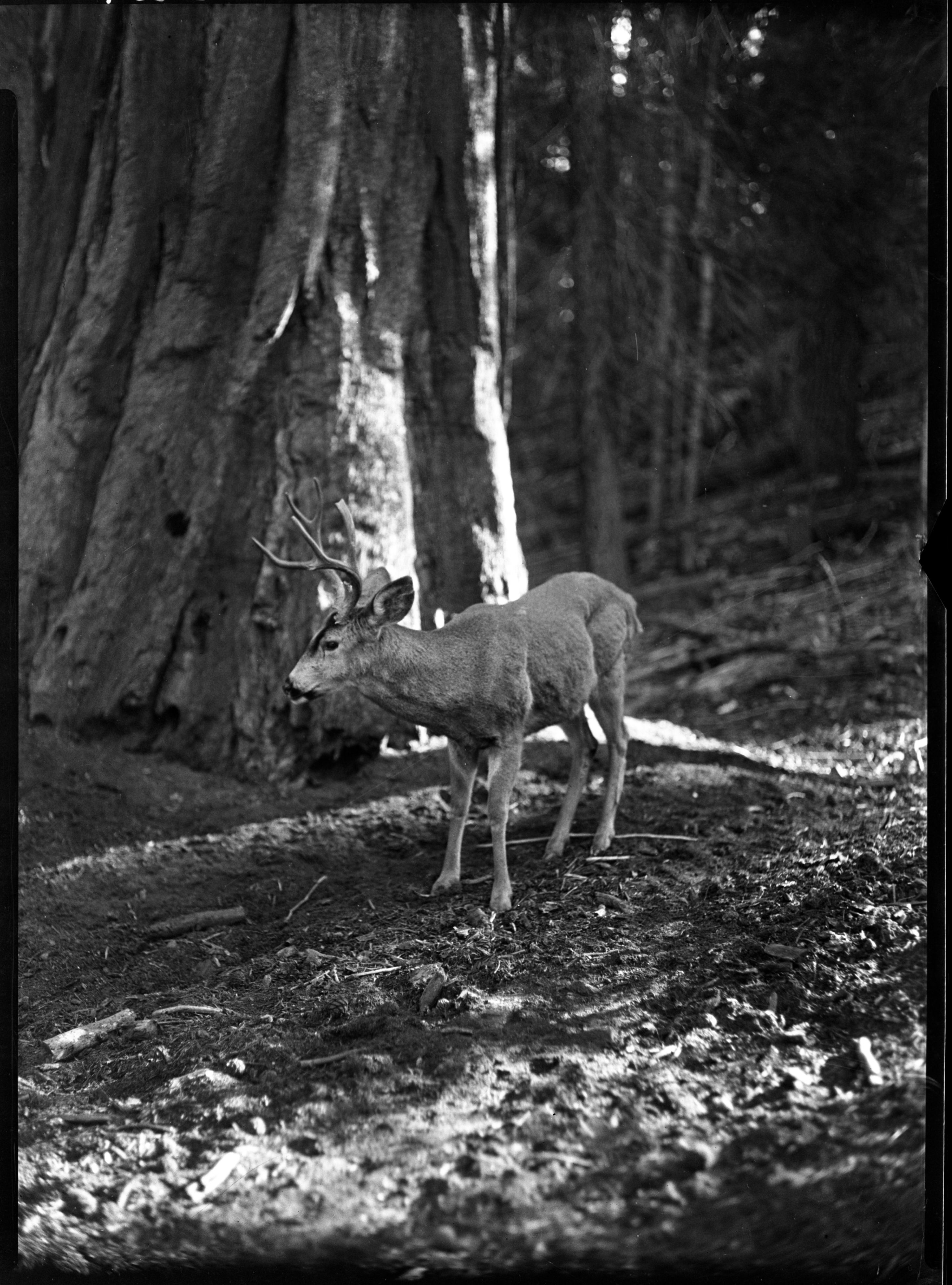 Joseph Dixon, 291218, Giant Forest, SNP, Deer, Mule Deer buck at base of Giant Sequoia.