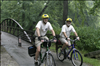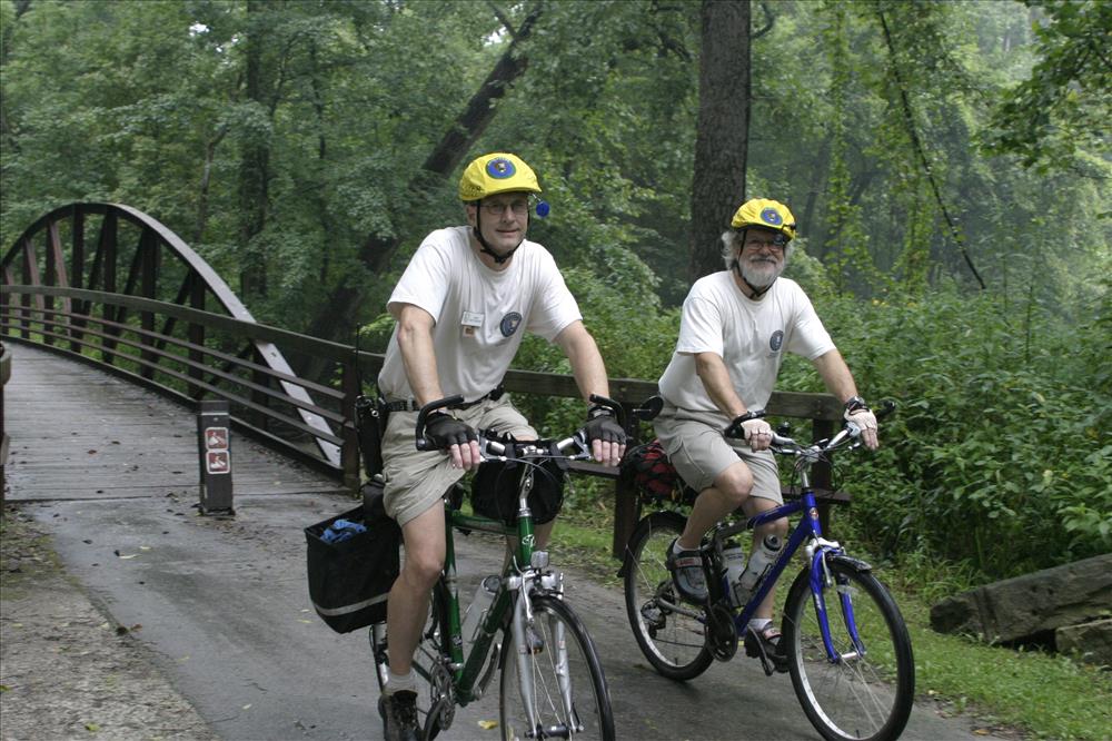 At Cuyahoga Valley National Park volunteers perform a wide variety of duties during every season of the year. Currently over 2,021 volunteers donate over 70,195 hours to the park. || Trailblazer volunteers assist the park by patrolling the Towpath Trail in pairs on bicycle. These volunteers are riding just north of Hunt Farm.