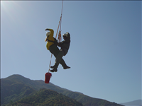 During emergency helitack operations, it is occasionally necessary to perform external transport of patient and/or park personnel a short distance to a good landing site where internal loading can take place. These images show training exercises using the equipment used to accomplish these operations. The short-haul program was initiated in Sequoia and Kings Canyon National Parks (SEKI) in 2003, and became fully operational in the summer of 2004. Training, with participation by SEKI and Yosemite NP helitack crew members, is given at Ash Mountain helibase in the early summer.