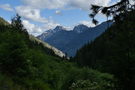 Two rugged rocky peaks are seen through the V of a forested valley.