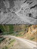 This photo pair features a section of the park road as it traverses the Eielson Bluffs. In this photo pair, note that one culvert was originally installed to drain the slope to the right, while later two culverts and a retaining wall had to be installed to keep the roadbed in its current position. Although there is an increase in shrub growth in that small drainage, what is remarkable is how stable the slope in the upper left side of the photograph actually is. The distinctive pattern of vegetation is nearly the same 80 years later, while if you look at it closely it appears it may breakup and slide down the slope at any moment.