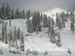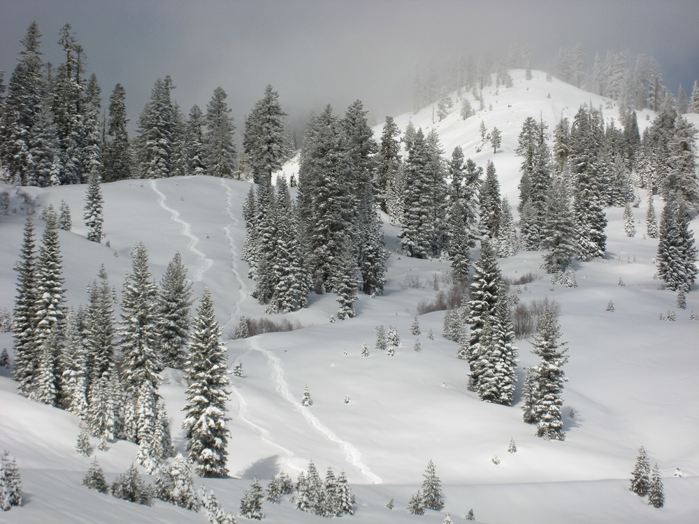Ski tracks on the snow on mountains near the Kohm Yah-mah-nee Visitor Center with fog and clouds.