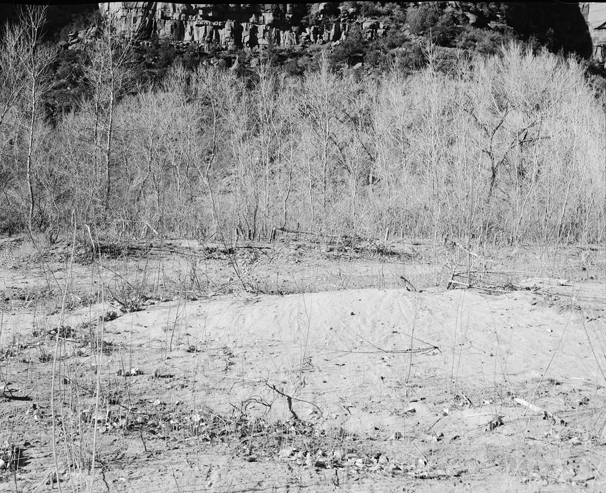 Beaver work along Virgin River near Weeping Rock southeast of Angels Landing. Fremont cottonwood. ; ZION Museum and Archives Image ZION 8837 ; ZION 8837