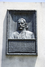 4' x 2' x 6' high, two-piece granite monument with 25" x 39" bronze relief portrait attached to front. Relief panel has inscription and decorative border.
