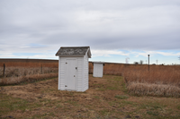 Two privies with white siding stand near each other in an area of mowed grass, with tallgrass prairie beyond.