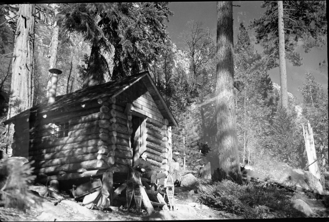Backcountry Cabins and Structures, Old snow surveyors cabin on Bubbs Creek, burned in forest fire, 1976. Nelson Murdock in cabin door.