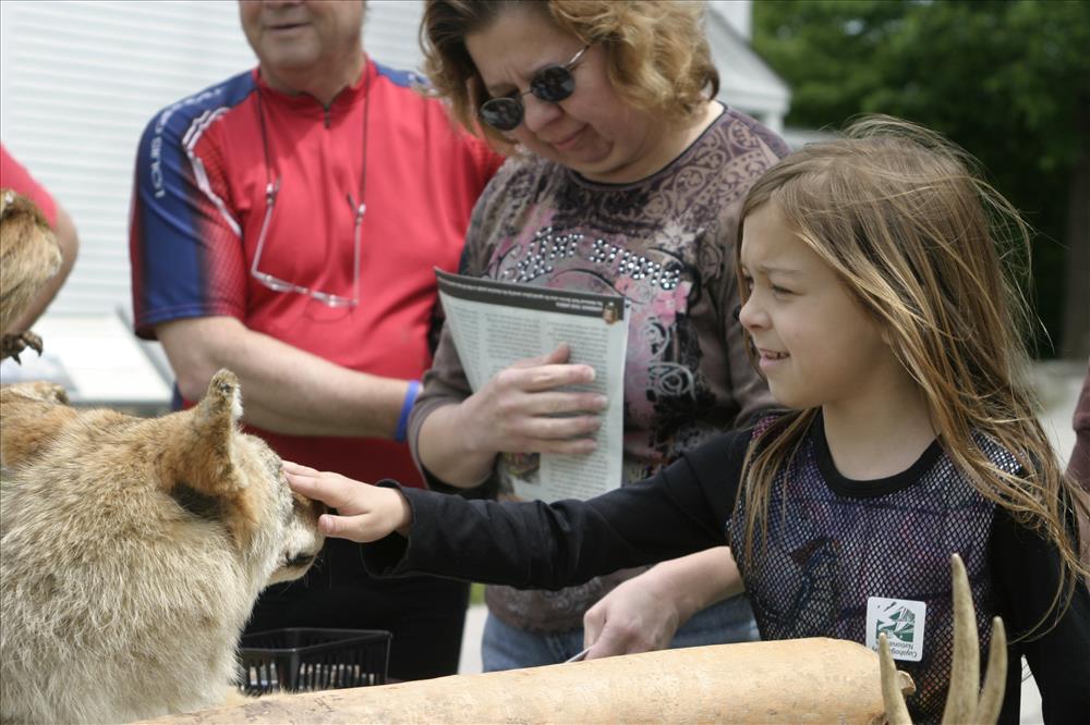 Cuyahoga Valley National Park offers a wide range of pulic programs throughout the year. Here visitors participate in a program in which they ride a train in one direction and bike back on the Towpath Trail, visiting interpretive stations along the way. || Visitors look at natural history items outside of Boston Store Visitor Center. Ranger Mike Kosmos talks to visitors nearby.