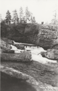 Two men on Hayes Island above the small eastern chute of the upper Kettle Falls. During or just after construction of the bridge to Hayes Island. Taken January 11, 1923.