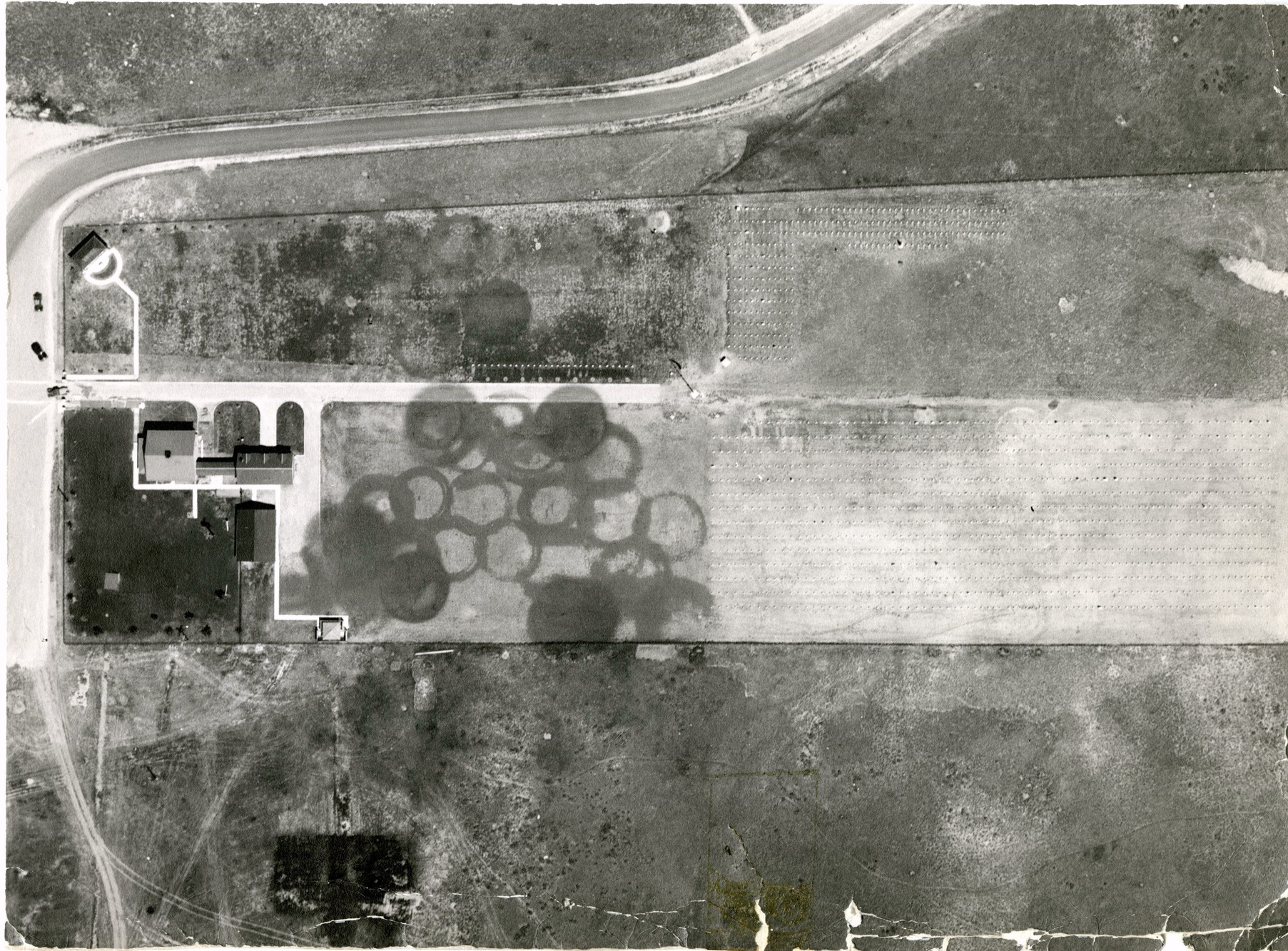 LIBI_00263_07885; A black and white aerial photograph. This image depicts an aerial view of the Stone House, cemetery, and Little Bighorn Battlefield. The year taken not known, but the Superintendent’s Lodge (Stone House) still had the stables. The speaker's platform in what is now Section F in the cemetery is also in the picture. The verso contains a faded stamp in blue ink that reads “Official Photograph Air Corps, W.S. Army” then a sunburst image and “[Ill] Photo Section Crissy Field San Francisco, Calif.” A pencil notation reads “deephale [?]”. The image is frayed on one side but in good condition.; photograph; Courtesy of the National Park Service, Little Bighorn Battlefield National Monument, LIBI_00263_07885, Air Corps of the U.S. Army, "Aerial Photograph of the Superintendent's Lodge, National Cemetery, and Little Bighorn Battlefield," date unknown.