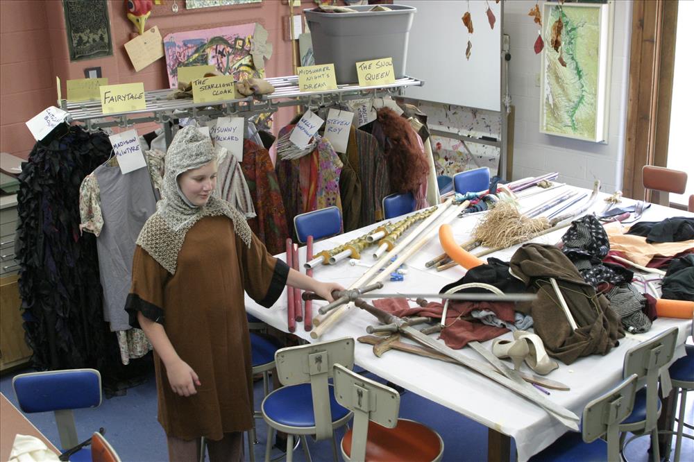 Since the mid-1990s, Cuyahoga Valley Environmental Education Center has offered a variety of summer residential camps. River Run - Theatre: "Fantasy in the Forest" is provided in partnership with Magical Theatre Company. Children entering grades 5-10 work with professional faculty to develop their performing arts skills in acting, voice, movement, and stage combat. The short performances are outdoors and integrate into the natural setting of the CVEEC campus. || Summer theatre campers get fitted for costumes.